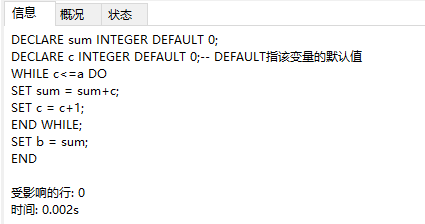 DECLARE b INTEGER DEFAULT 0;-- DEFAULT指该变量的默认值